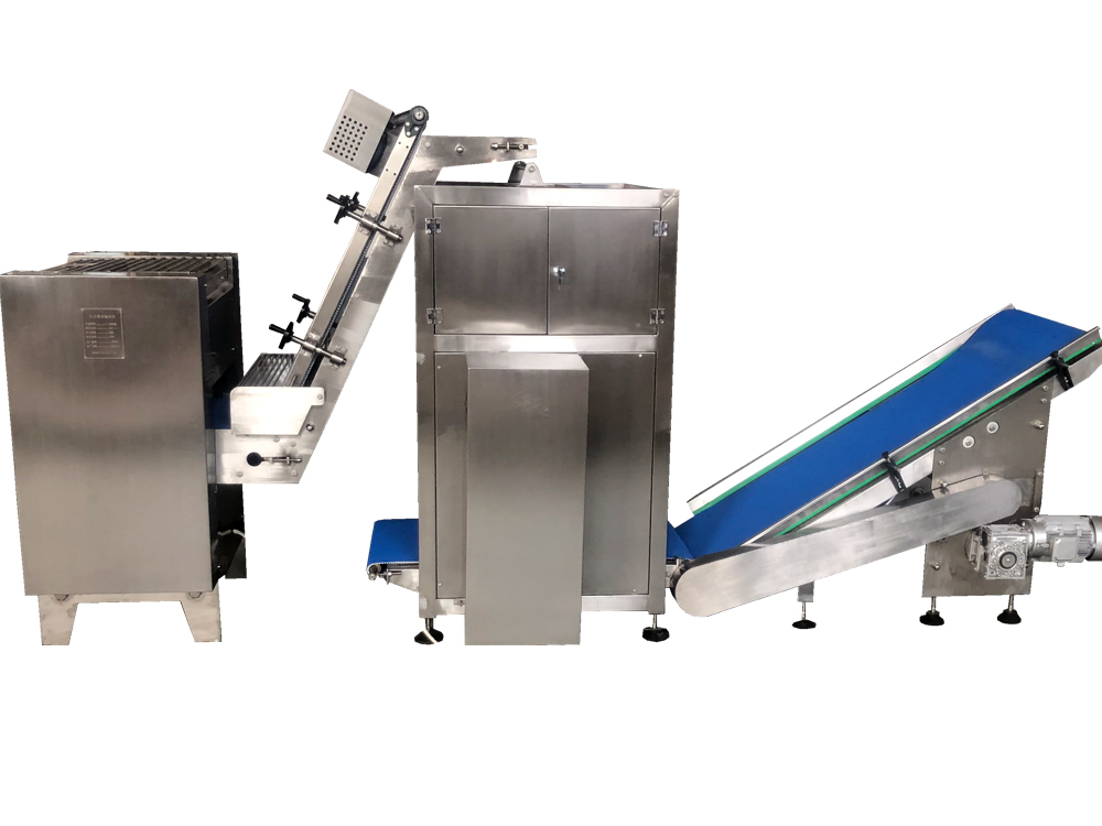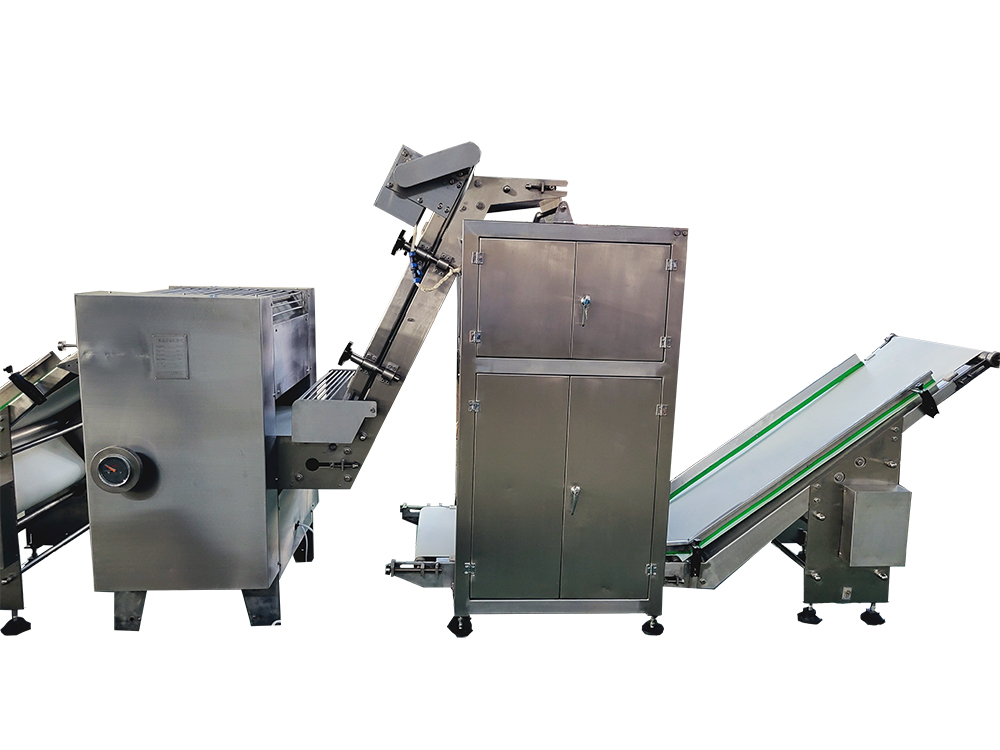 →復(fù)合、壓延、疊層、分切卷皮機(jī)系列  →型號215/230/280/330/360/540/560型。225型殘皮還原機(jī)  →功能  該系列為配套國內(nèi)外品牌的餃子機(jī)、餛飩機(jī)使用的面帶軋制設(shè)備。  →特色  1、復(fù)合機(jī)搭配搗面裝置,可使真空和面機(jī)和制出的團(tuán)狀、絮狀面團(tuán),自動連續(xù)的進(jìn)入軋制過程?! ?、疊層機(jī)使面帶Z字型折疊,進(jìn)一步豐富面帶網(wǎng)狀結(jié)構(gòu),提高面筋度,設(shè)備可根據(jù)客戶場地需求選擇不同的擺放形式?! ?、多組壓延機(jī)為變頻控制,每一道壓輥都采用單機(jī)驅(qū)動,通過測距傳感器,實(shí)現(xiàn)自動面帶張緊控制,多輥聯(lián)動。進(jìn)一步簡化操作,保證壓延比,滿足多種工藝要求,加工出質(zhì)量穩(wěn)定的面帶。  4、可根據(jù)不同餃子機(jī)要求軋制不同 規(guī)格厚度及寬度的面帶,面帶經(jīng)過分切后自動打卷,操作簡單,安全可靠?! ?、以上設(shè)備均采用不銹鋼軋輥,及符合國家衛(wèi)生標(biāo)準(zhǔn)材料。  6、具體壓輥對數(shù)可根據(jù)客戶實(shí)際需求定制?!  饕夹g(shù)參數(shù)產(chǎn)品型號總功率(kW)高線速度(m/min)壓面厚度(mm)電壓(V)外形尺寸長×寬×高(mm)215型8.1515457263807104*764*1356230型8.1515457263807104*764*1356280型8.1515457263807104*764*1356330型8.9515457263807104* 884*1356360型8.9515457263807104* 884*1356400型8.9515457263807104* 884*1356540型13154572638010386*1400*1400560型13154572638010386*1400*1400225型殘皮還原機(jī)1.58.26380950*1130*1500